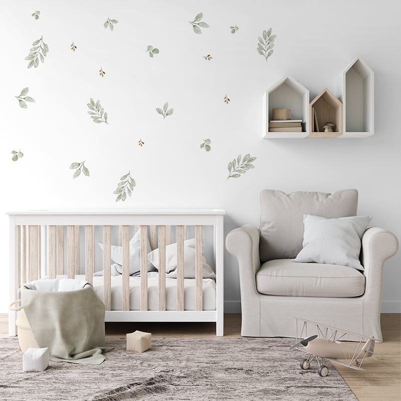 The "Eucalyptus Fall" set is not just about decoration; it's about creating an atmosphere. With leaves that look as though they've gently fallen onto your walls, this set brings an organic and soothing vibe to your nursery. It's an invitation to tranquility and a subtle nod to the great outdoors, perfect for inspiring calm and imagination in your child's daily life.