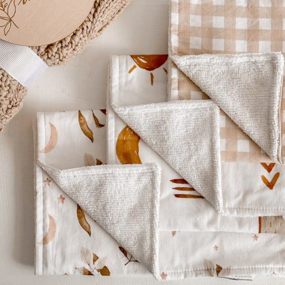 Our Mystery wash cloth Packs are very popular for those trying to keep their nappy bag organized and stylish. Pair them along with our Burp Cloths and keep in mind our Baby Jersey Swaddle Wraps available in over 30 prints.