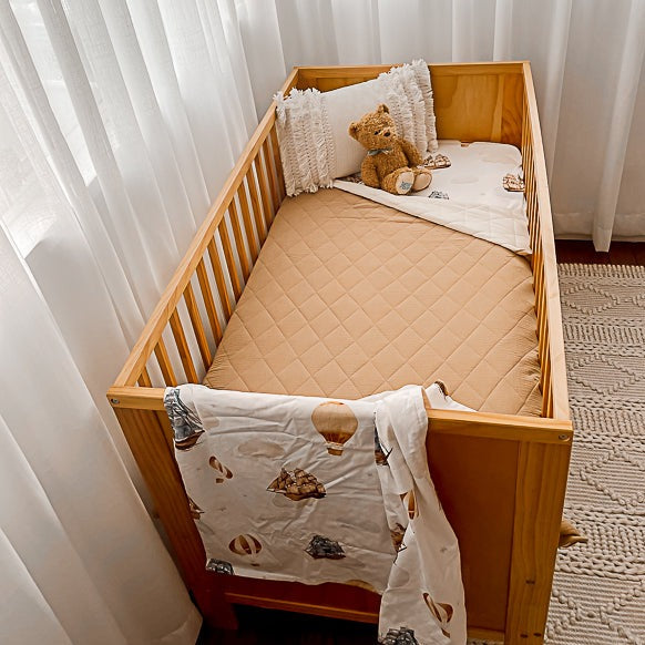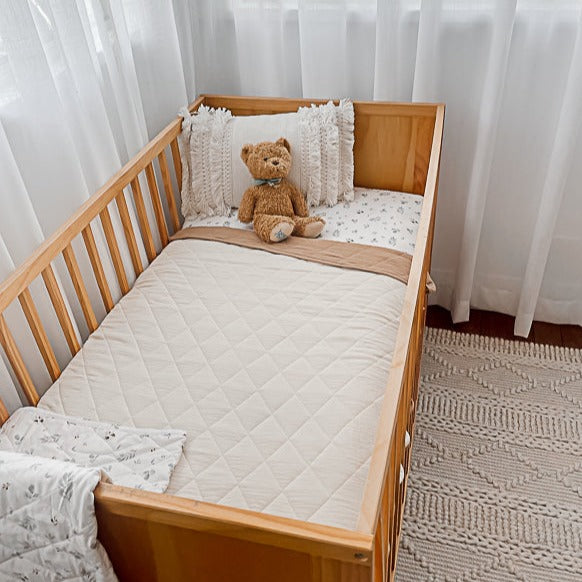 The quilted design adds a touch of enjoyable elegance to your nursery decor. It's perfect as a cot coverlet, offering a cozy haven for your newborn. When using it in the cot, simply tuck it in tightly to prevent any gathering, ensuring your baby's uninterrupted sleep.