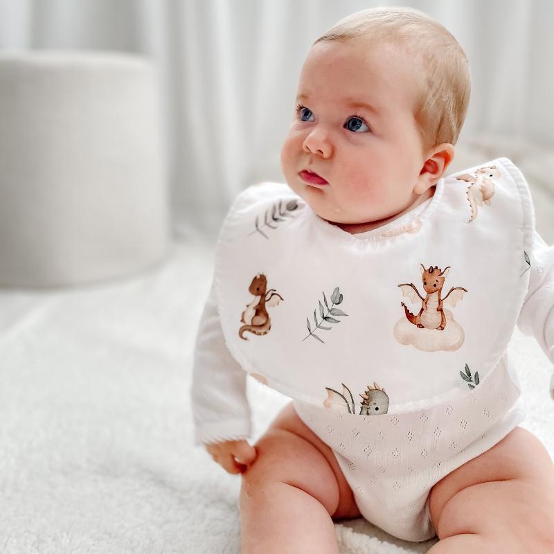 Baby sitting in a Mystique dragon print bib, crafted with organic cotton and absorbent microfiber to keep messes under control.
