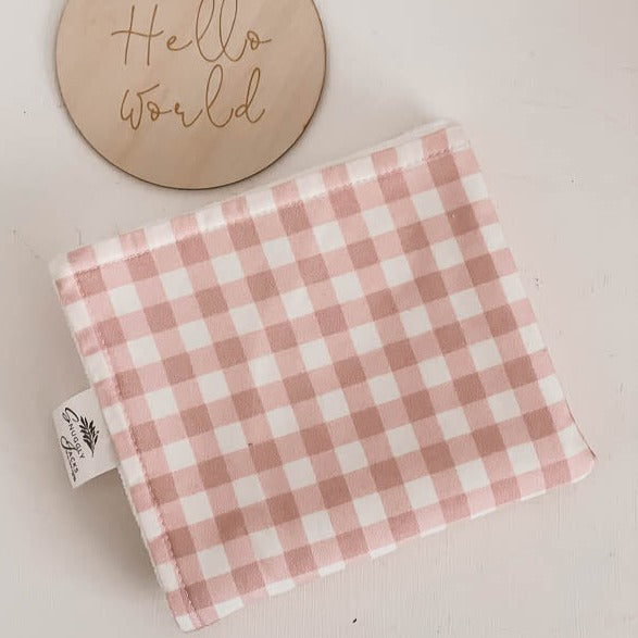Our Peachy Pink Gingham burp cloths are very popular for those trying to keep their nappy bag organized and stylish. Pair them along with our Jersey Swaddle Wraps and keep in mind our Bassinet Sheet / Change Mat Covers available in over 30 prints.