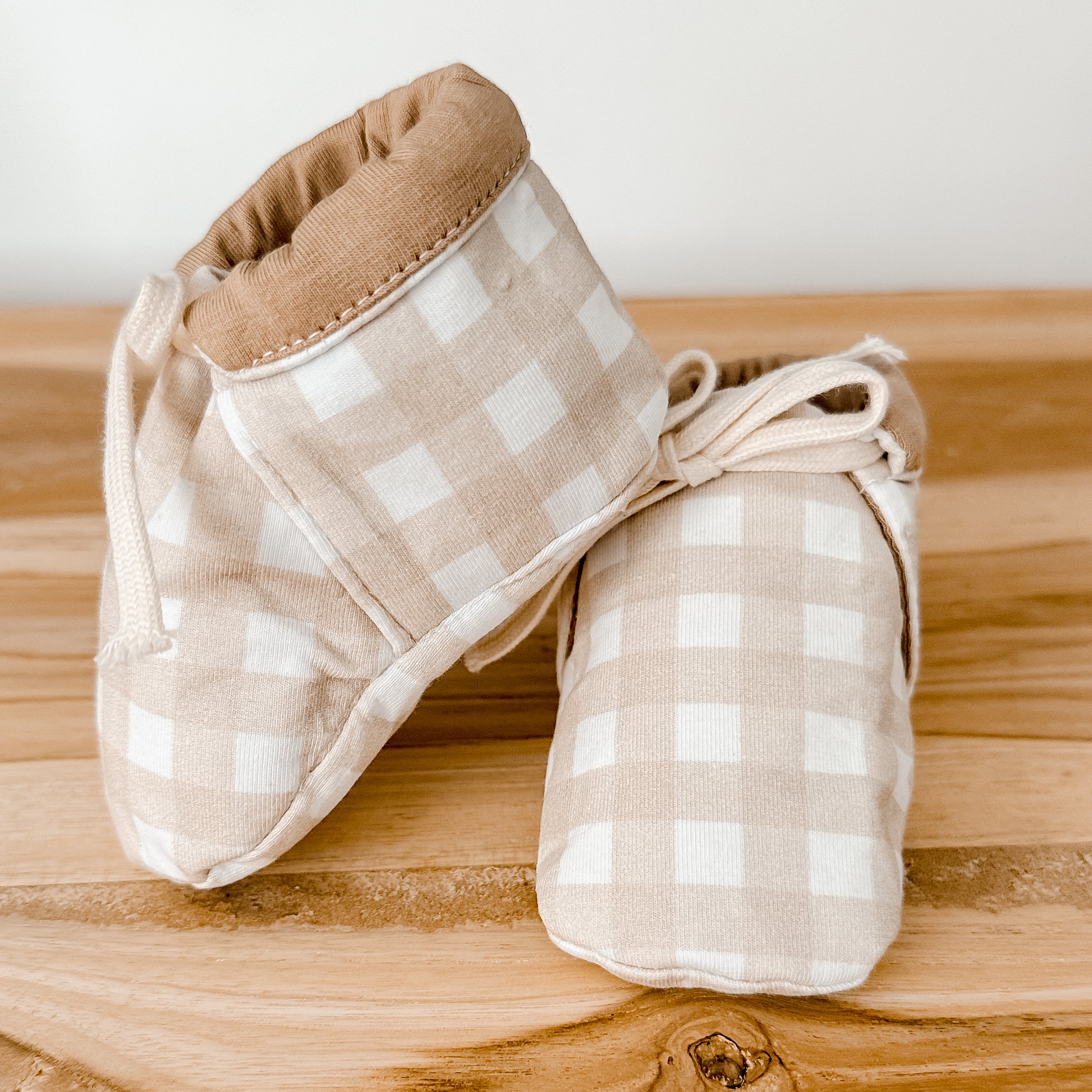 Keep your baby's feet warm this winter with Snuggly Jacks best selling Sand Gingham organic jersey cotton booties.