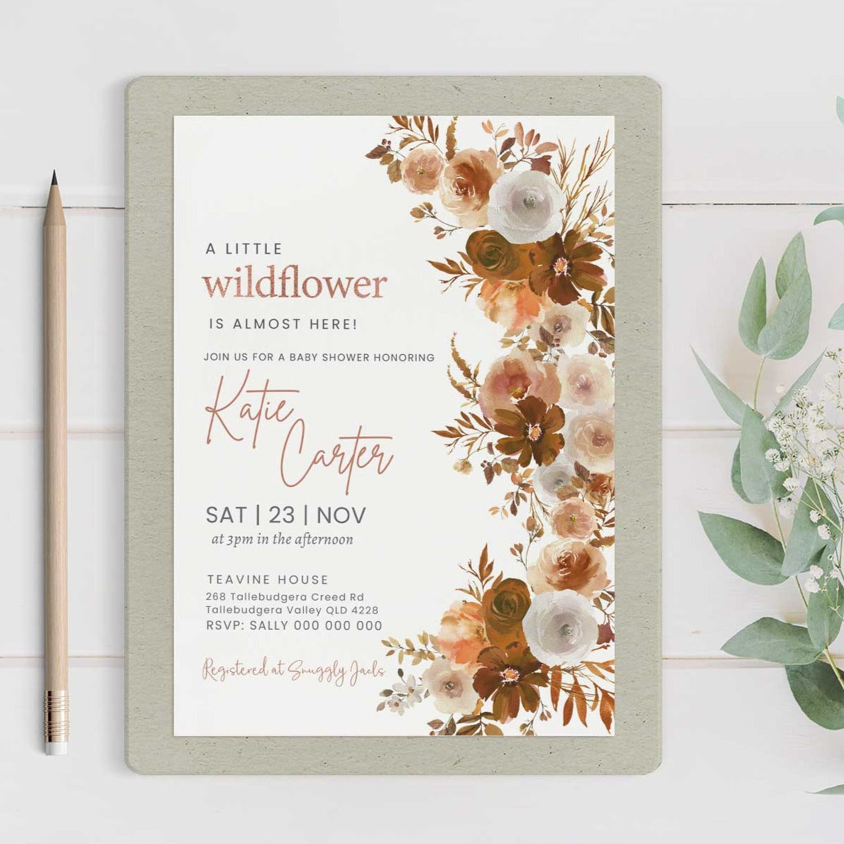 Entirely Customizable Floral Baby Shower Invitation with easy to use, Canva application. Once your editable invite is fully personalized and downloaded send your shower evite through SMS, iMessage, email, WhatsApp or any needed platform. You can also print at home or with any print on demand service.